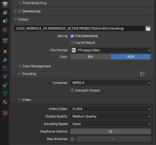 Pada menu Output Properties, pastikan pilih dimana file akan disimpan terlebih dahulu. Lalu ubah File format ke FFmpeg Video dan buka tab Encoding lalu pilih Container MPEG-4
